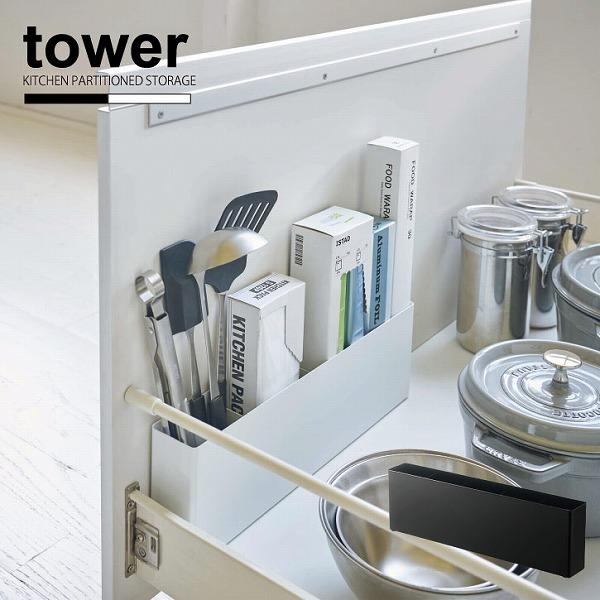 ラップやキッチンツールを立てて収納できるスリムなワイドラック お歳暮 見つけやすく取出し簡単で超便利 シンク下仕切付きワイドラック タワー Tower 間仕切り4枚付き 収納ケース ワイド スタンド 4924 4925 収納ボックス キッチン収納 引き出し用 Yamazaki サランラップ